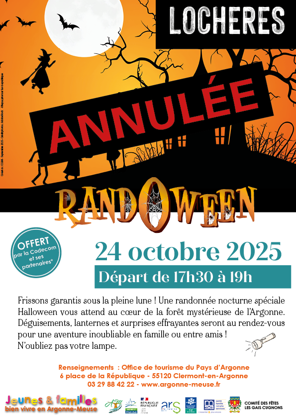 En raison des conditions météorologiques défavorables annoncées, nous sommes contraints d’annuler la Rando’Ween prévue ce vendredi 24 octobre à Lochères.