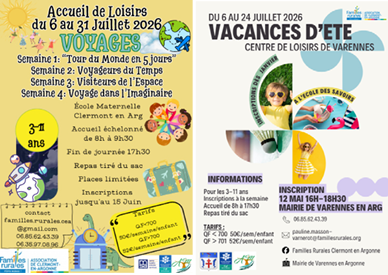 Cet été, l’association Familles Rurales de Clermont-en-Argonne propose deux accueils de loisirs pour les enfants de 3 à 11 ans sur le territoire de la Communauté de Communes Argonne-Meuse ! 🎨✈️🚀